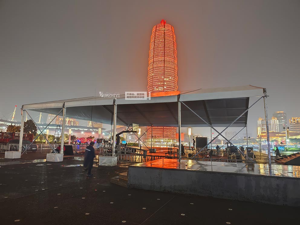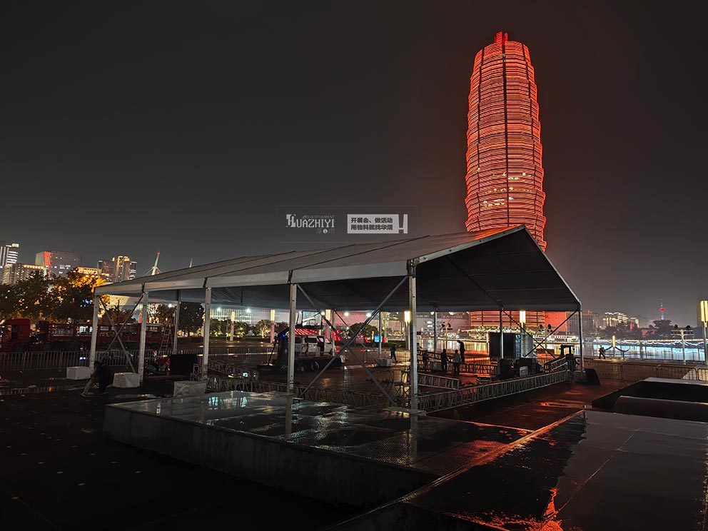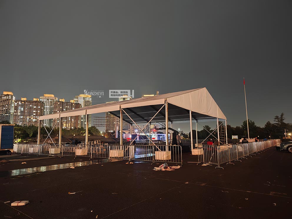 焦作篷房铁马出租搭建的白色人字形篷房采用大跨度设计,纯白篷布搭配银色铝合金支架,外观简约大气,与如意湖广场的开阔环境相融合,同时在视觉上形成清晰的服务标识。四周无篷布遮挡,篷内空气流通顺畅,即便户外炎热,也能保持凉爽舒适的环境。