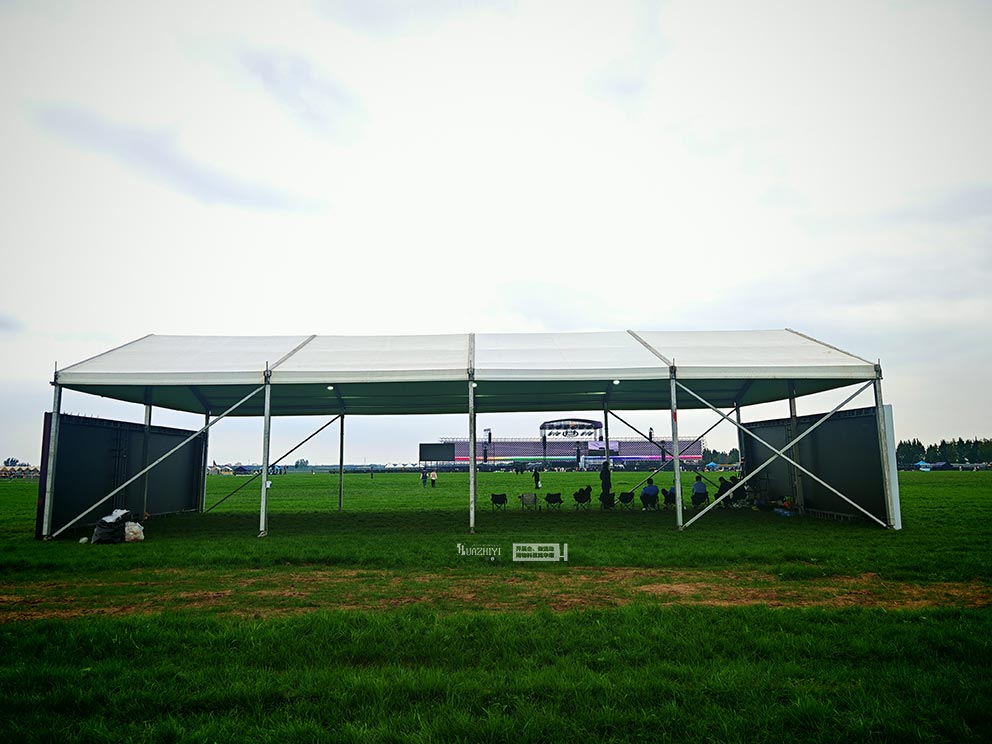 邯郸邢台篷房租赁搭建的人字形篷房,选用白色高密度PVC篷布,搭配银色铝合金支架,外观简约大气且抗风防雨。人字形篷房的高顶设计提升了内部空间感,四周无篷布的设计,即便人员密集也能保持空气流通,避免闷热。