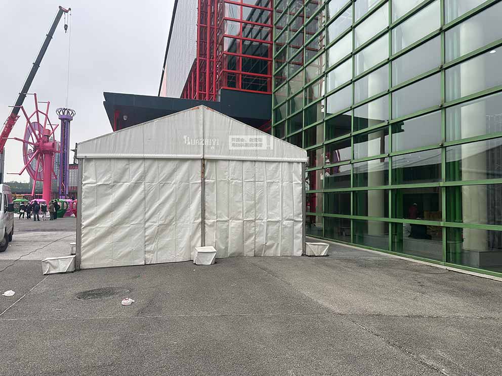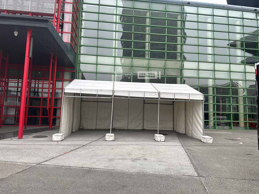 水泥地、沥青地等硬化场地硬度高,地钉难以打入,此时地钉并非必需,需用其他固定方式替代。鹤壁篷房出租会根据篷房类型选择替代方案:对于小型折叠帐篷,采用加重底座固定,每个底座重量15-20公斤,通过螺栓与篷房立杆连接,直接放置在硬化地面即可;对于大跨度人字形篷房,则采用膨胀螺栓固定,在篷房底座预设的螺栓孔处打入膨胀螺栓,将篷房与地面牢牢锁定。