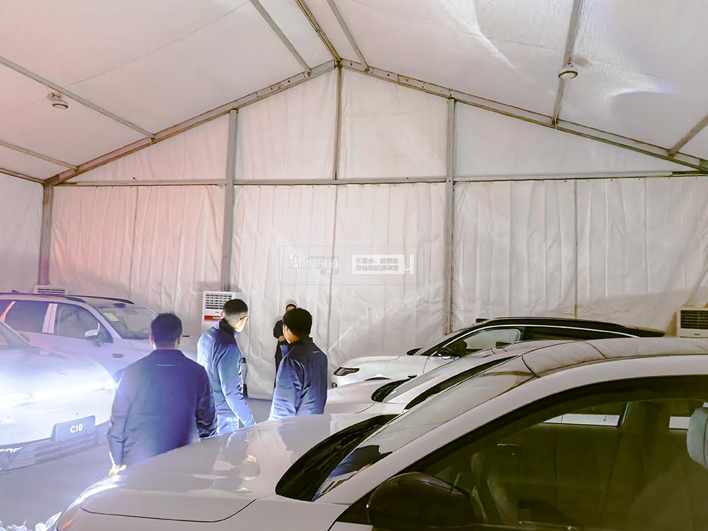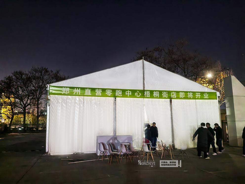 周口篷房租赁深入洞察零跑汽车简约、科技的品牌内核,为此次临时展蓬搭建白色人字形篷房。经典的人字形结构线条流畅利落,不仅最大化拓展了内部展示空间,实现无立柱遮挡的通透布局,让多款零跑车型能有序陈列,方便消费者自由观赏、近距离体验车辆细节;纯净的白色篷布更是点睛之笔,既与零跑汽车的品牌视觉风格高度契合,又能反射阳光让篷房内光线充足柔和,清晰呈现车辆的外观设计与内饰质感,同时在梧桐街的户外环境中极具辨识度,轻松吸引过往行人目光。
