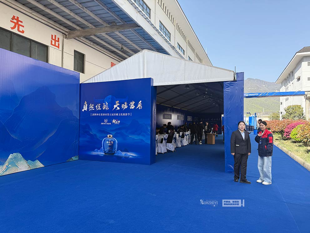 定制款蓝色篷房成为活动现场的亮眼标识,色调清新雅致,与神农架的青山绿水相映成趣,既呼应了劲牌神农架酒业的生态理念,又兼具实用功能。篷房采用高强度框架与优质篷布,防晒防水、稳固耐用,可灵活划分封藏仪式区、休憩区、展示区,为各项活动的顺利开展提供可靠空间保障,同时成为现场打卡取景的热门场景。